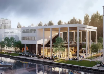 Right beside the water and just a stone’s throw away from the Berlin ring railway, our newly constructed campus offers 12,000 square metres of modern and functional facilities that will help our students learn and develop in an inspiring surrounding.